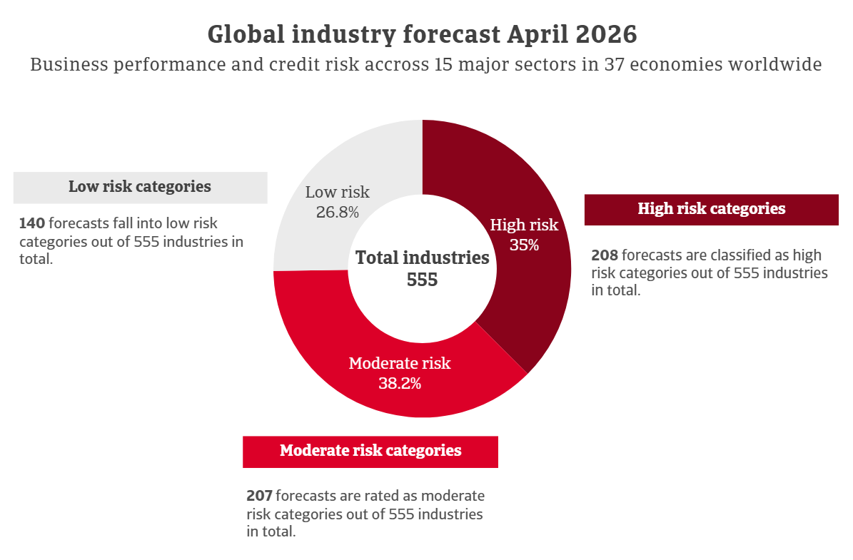 In totaal zijn er 555 prognoses gepubliceerd. Hiervan vallen er 140 in de categorieën met een laag risico, 207 worden beoordeeld als matig risico en 208 vallen in de categorie met een hoog risico. Dit betekent een toename van 14 sectoren in de groep met een hoog risico sinds januari 2026. De chemiesector is het zwaarst getroffen door recente neerwaartse bijstellingen, waarbij de omstandigheden in Europa het sterkst verslechteren. Dit resultaat is niet verrassend, gezien de sterke blootstelling van de sector aan scherpe schommelingen in de olie- en gasprijzen als gevolg van de oorlog in de Golf.
