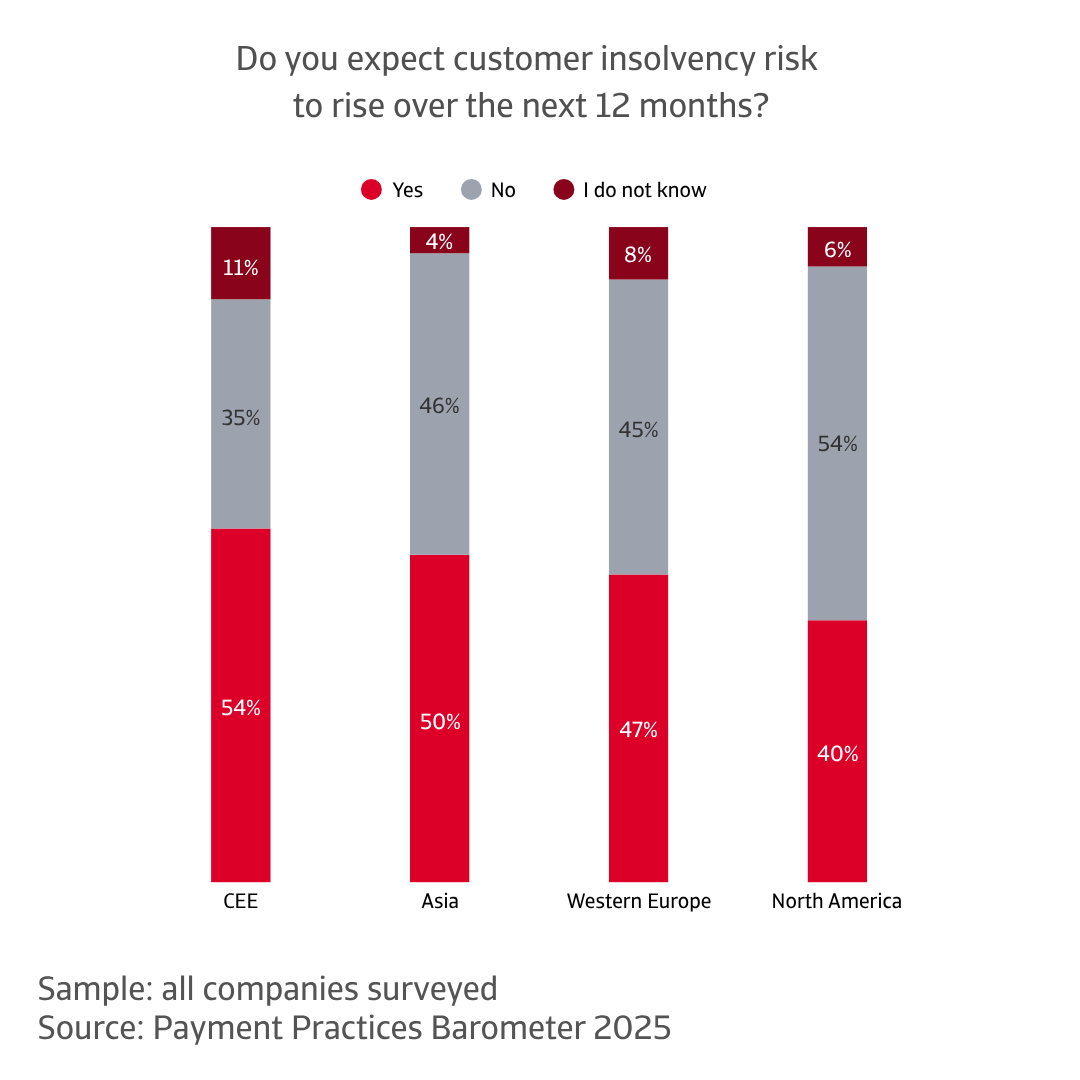 In West-Europa zijn de verwachtingen meer verdeeld. Sommige bedrijven denken dat de huidige omstandigheden stand zullen houden, terwijl andere zich schrap zetten voor een verslechtering, wat een weerspiegeling is van de economische onzekerheid in de regio. In Centraal- en Oost-Europa is de bezorgdheid groter. Bedrijven in die regio's zijn bijzonder op hun hoede voor een mogelijke toename van het aantal insolventies, gezien hun blootstelling aan mondiale tegenwind en de noodzaak van robuust risicobeheer.
