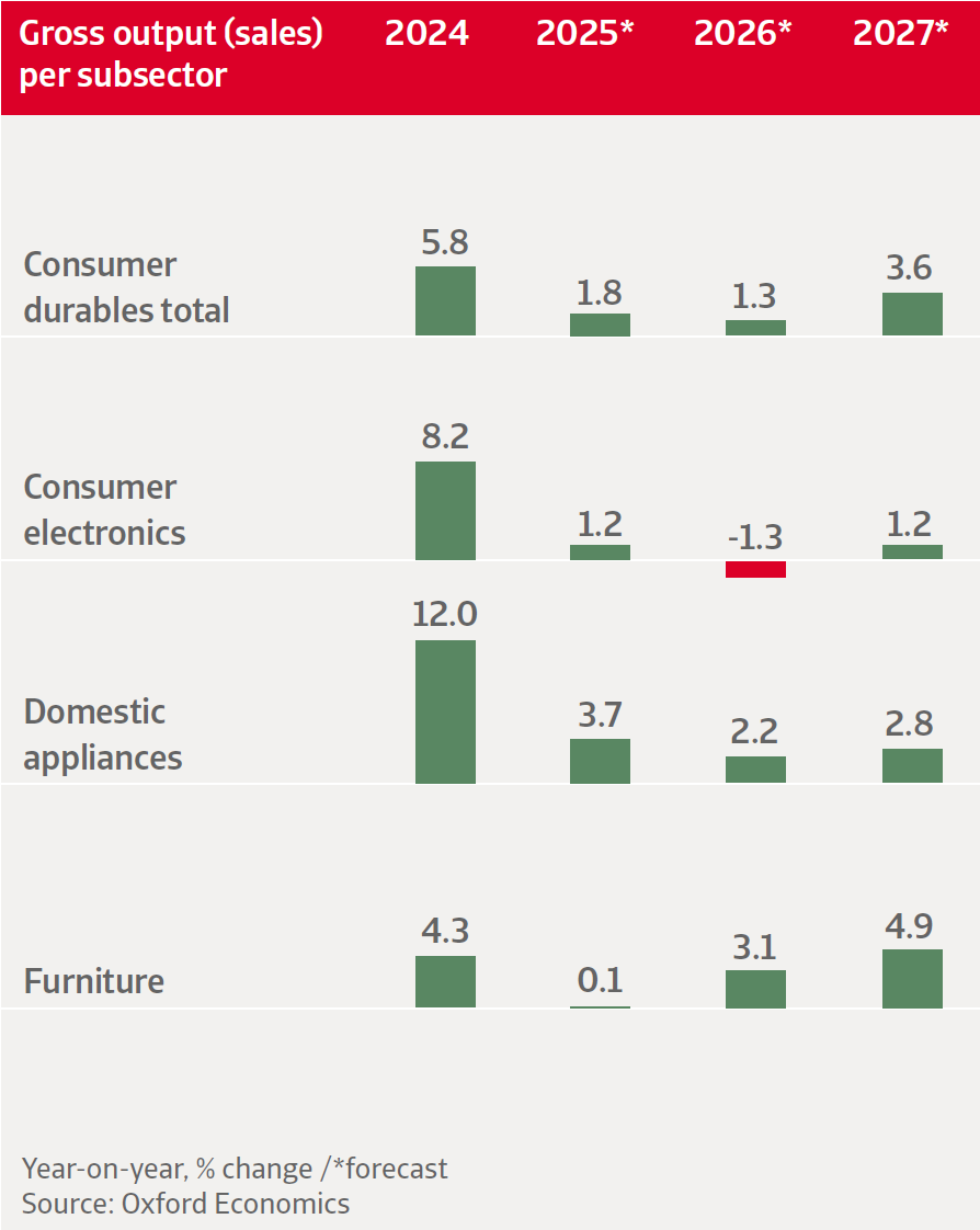 • After increasing by 5.8% in 2024, global sales growth of consumer durables is forecast to slow down to 1.8% in 2025 and 1.3% in 2026